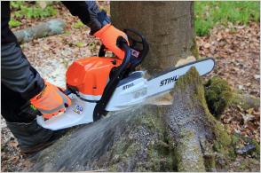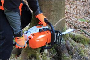 Das Startverhalten ist beeindruckend, meistens reichen ein bis zwei Züge am Startergriff und die Säge läuft. Ebenso reicht ein kurzer Druck auf den Kombischalter in Richtung „Stop“ und der Motor geht aus. Der Schalter kann nicht in der „Stop“-Position arretiert werden und federt immer wieder in die Betriebsstellung zurück. Im Test überzeugte dieses technische Detail, denn dadurch gehören erfolglose Startversuche durch eine falsche Hebelstellung der Vergangenheit an.
